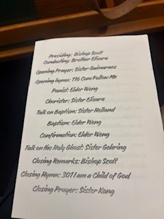 Saturday 1/3 – We had to clean our flat this morning then walked to a park to meet our sister buddies for a lesson with Russo. Another beautiful lesson, talking about having faith in Jesus Christ and the power of prayer. I love to be in these settings where everyone contributes to the conversation, sharing experiences and testimony of the Lord’s work and blessings in their lives. We walked home feeling so uplifted! Some missionaries came over to use our computer, as one of the elders is submitting his final paperwork to attend BYU Hawaii after his mission ends this spring. Meanwhile we made food for Jennifer’s baptism. We LOVE our friend/dear sister Jennifer who got baptized Saturday evening. Although she only speaks Mandarin Chinese, we are able to communicate through other people translating, a translating app on the phone, and the language of love! She is truly a treasure! Her son and his partner also came to the baptism service and we were so happy to finally meet him and let him know how much we love his mom. When we sat down in the chapel for the service and were able to sing the opening song, Eric handed me the program and said, “Did you know that your name is on the program? I looked and saw that I was giving the first talk on baptism. I only had through the opening song to try to gather my thoughts and say a prayer for help and guidance. After the opening prayer, it was announced that I would speak. I totally felt the Spirit guide me on what to say about the need for baptism, talking about the Savior, who was perfect, was even baptized to fulfill all righteousness and show us an example. That was one of those miraculous experiences were I felt the truthfulness of the words of the Savior from the book of Mark, “take no thought beforehand what ye shall speak…but whatsoever shall be given you in that hour, that speak ye: for it is not ye that speak, but the Holy Ghost.” Also, in Doctrine and Covenants section 84 where the Lord says, “85 Neither take ye thought beforehand what ye shall say; but treasure up in your minds continually the words of life, and it shall be given you in the very hour that portion that shall be meted unto every man (or women).” After the baptism I leaned over to Eric and said, “Thank goodness you saw my name in the program and pointed it out to me!” Eric replied that he hadn’t seen my name but had only handed me a copy of the program. It must have been the Spirit that said to me, “Did you see that your name is on the program?” I am sooo grateful for that prompting so I had a couple minutes to collect my thoughts and pray for guidance!