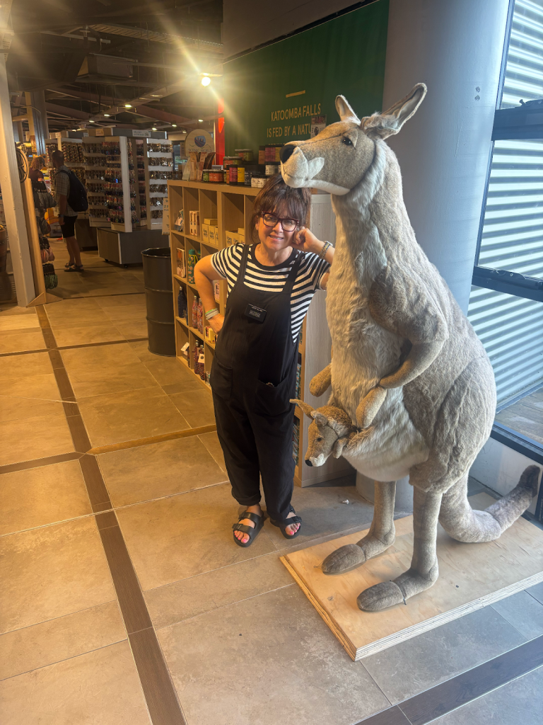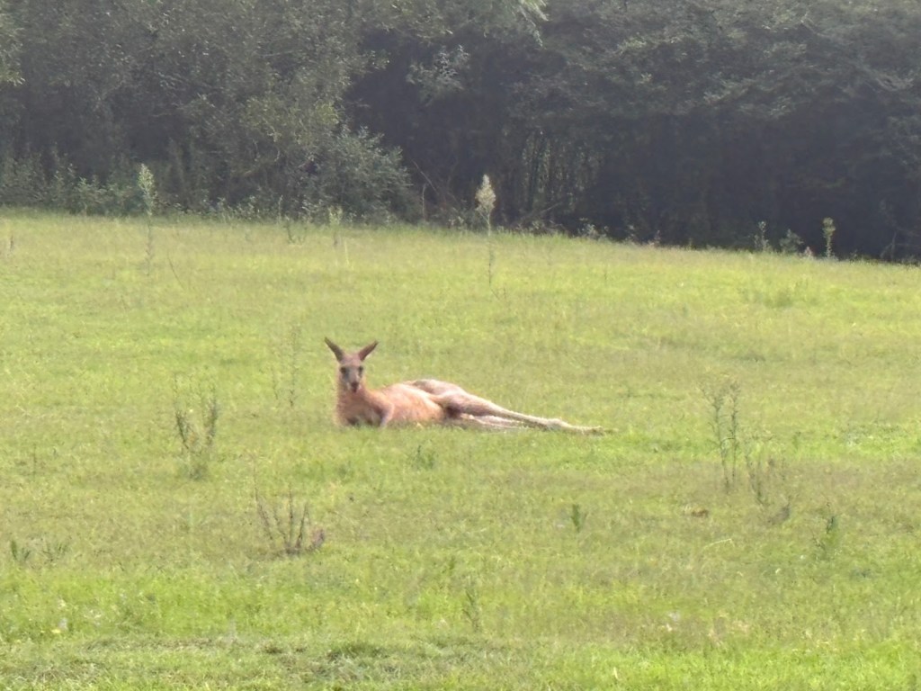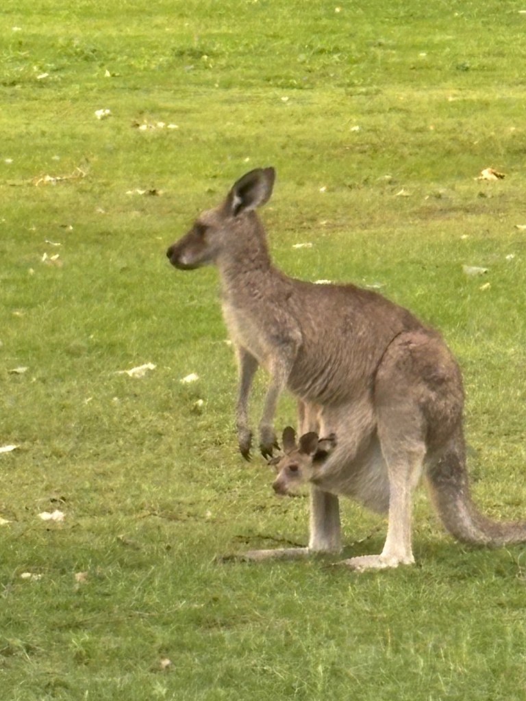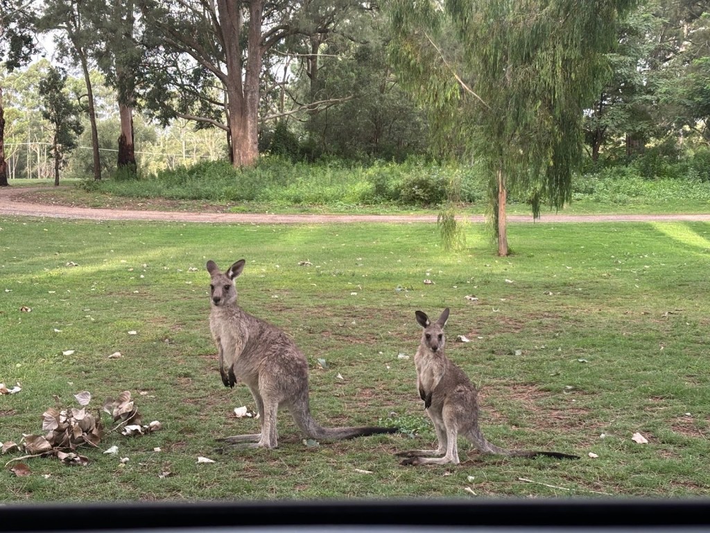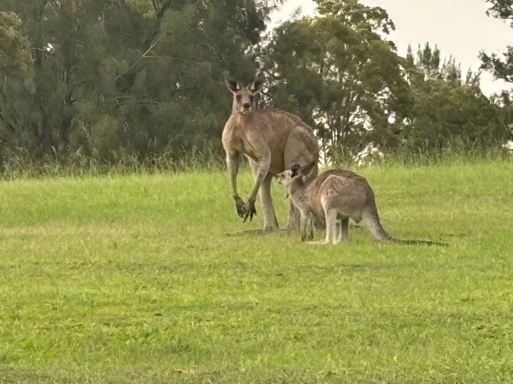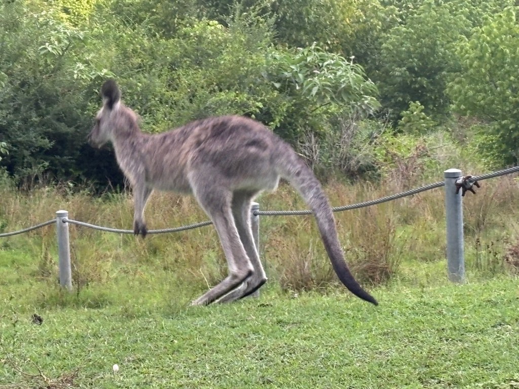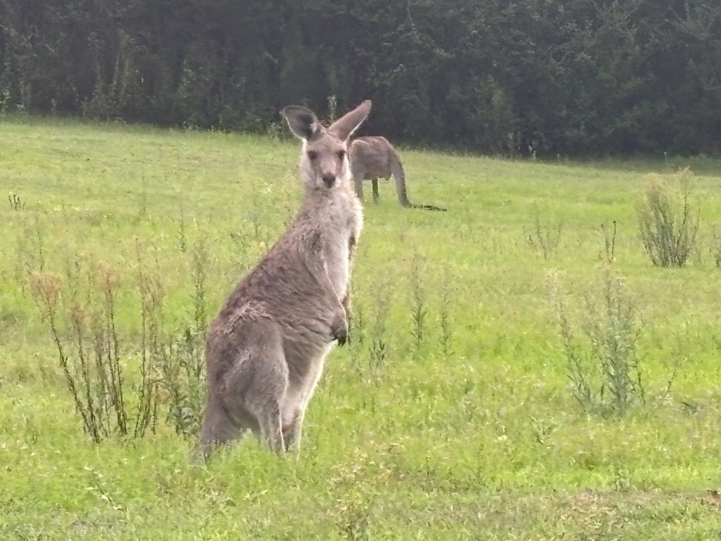 Wednesday – Nate and Kaitlin went with us to a zone training about an hour away. While we were teaching they found a yummy spot for breakfast. Afterwards, we all drove another hour and a half to the Blue Mountains Scenic World. The canyon park there (Blue Mountains) is twice as big as the Grand Canyon National Park. While there we had lunch then took the Skyway tram across a canyon. The tram had a glass bottom so you could see down as we traveled across – cool and freaky at the same time! When we arrived on the other side, we took a quick “hike” down to see a waterfall. The line to take the tram back was long. After we arrived again at the “home base” we took the railway – which is the steepest railway in the world at a 52 degree incline – to the bottom of the canyon and we explored the rainforest walking on a raised plank platform. Next time we go I definitely want to take some of the longer trails at the bottom but we ran out of time. To get back out of the canyon we rode a Cableway to the top. This was our first time in a rainforest and it was truly beautiful! Fortunately (or unfortunately), we didn’t see any animals in the rain forest but they did let us know that a big, poisonous black snake had been on the platform with a crowd right before we arrived, waiting to ride the tram – eek! An employee at the bottom told us that he had seen multiple large snakes, birds, and insects in his time working there. On our way back to Sydney we took a detour to Cattai Campground, famous for its high kangaroo population. We stopped for ice cream then took pictures of at least 100 kangaroos at the campground. It’s kind of crazy how they can all stop eating the grass and stare at you for an infinite amount of time. If you try to get too close to them, they run away. I kept thinking they’d be like a dog and walk over to let me pet it but that DIDN’T happen – ha ha!